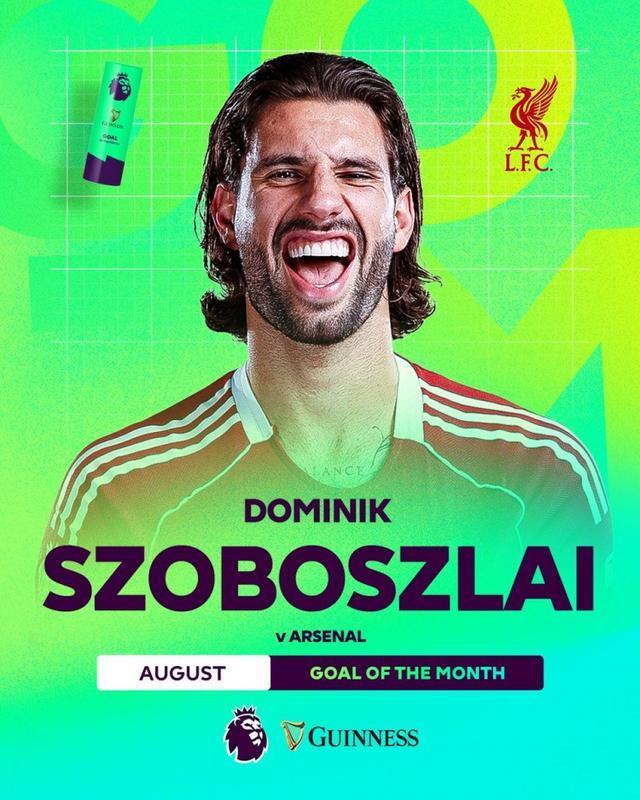 英超第三轮比赛,索博斯洛伊任意球直接破门,攻入全场唯一进球,帮助利物浦主场1-0击败阿森纳,英超官方宣布这记世界波当选8月份最佳进球。